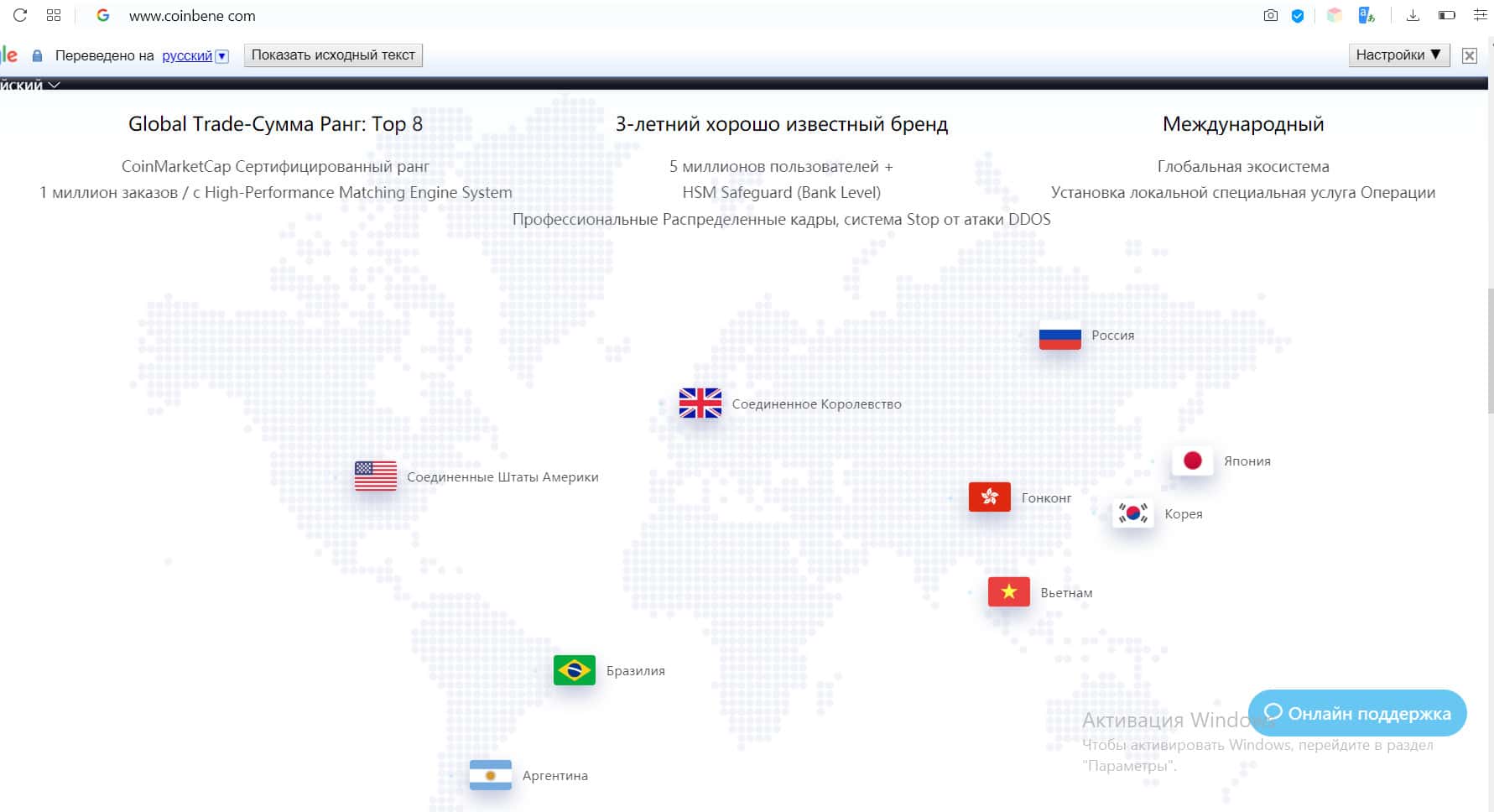 Далее идет блок с картой, где видно, что Коин Бене распространяется по всему миру. Выложена информация о том, что у ресурса пять миллионов пользователей и она находится в топ-10 криптовалютных бирж мира. Как нам хорошо известно, данные сильно завышены, а на платформе торговали фрилансеры под видом клиентов.