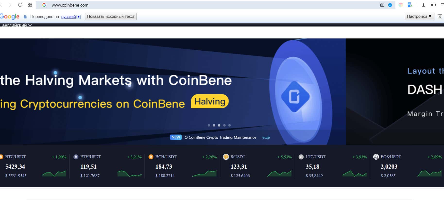 Владельцы крипторесурса Коин Бене не стали размещать на своем сайте множество ненужных лозунгов, как это делают другие лжебиржи. Под банерами в верхней части главной страницы сразу видно котировки и стакан цен. Русской версии здесь нет, поэтому необходимо пользоваться электронным переводчиком.