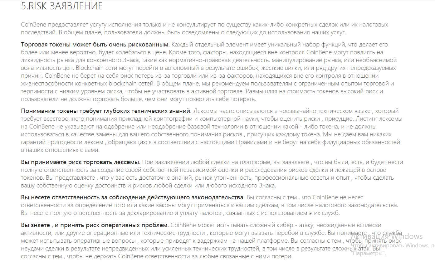 На сайте биржи CoinBene можно найти документ, включающий в себя клиентское соглашение и политику конфиденциальности. Там же прописано и раскрытие рисков. С помощью автоматического переводчика документ переводится на русский язык, хотя и с искажениями. Но смысл понять можно.
