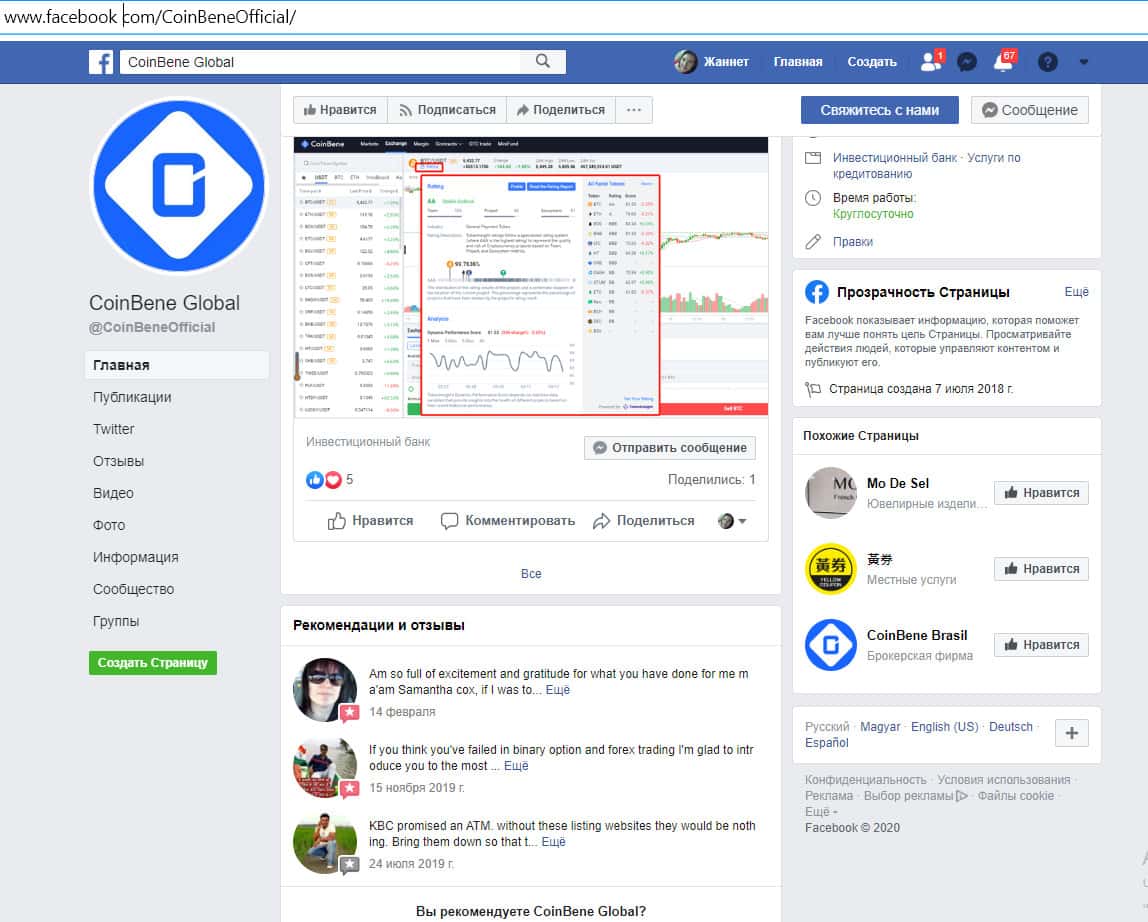 Аккаунт в сети Фейсбук хорошо раскручен, на него подписаны более 11 000 пользователей. Каждый день выходят новые посты. Есть положительные отзывы, рекомендующие компанию Коин Бене от азиатов.