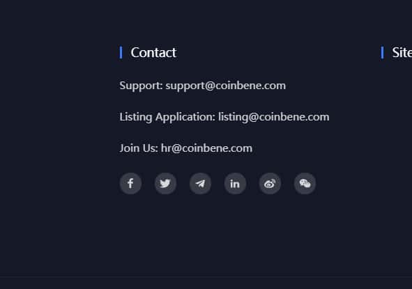 На главной странице сайта CoinBene можно увидеть иконки соцсетей, в которых брокерская компания разместила свои аккаунты. Это всем известные международные группы Фейсбук, Твиттер, Линкедин и азиатская Вейбо. Также есть канал в мессенджере Телеграм.