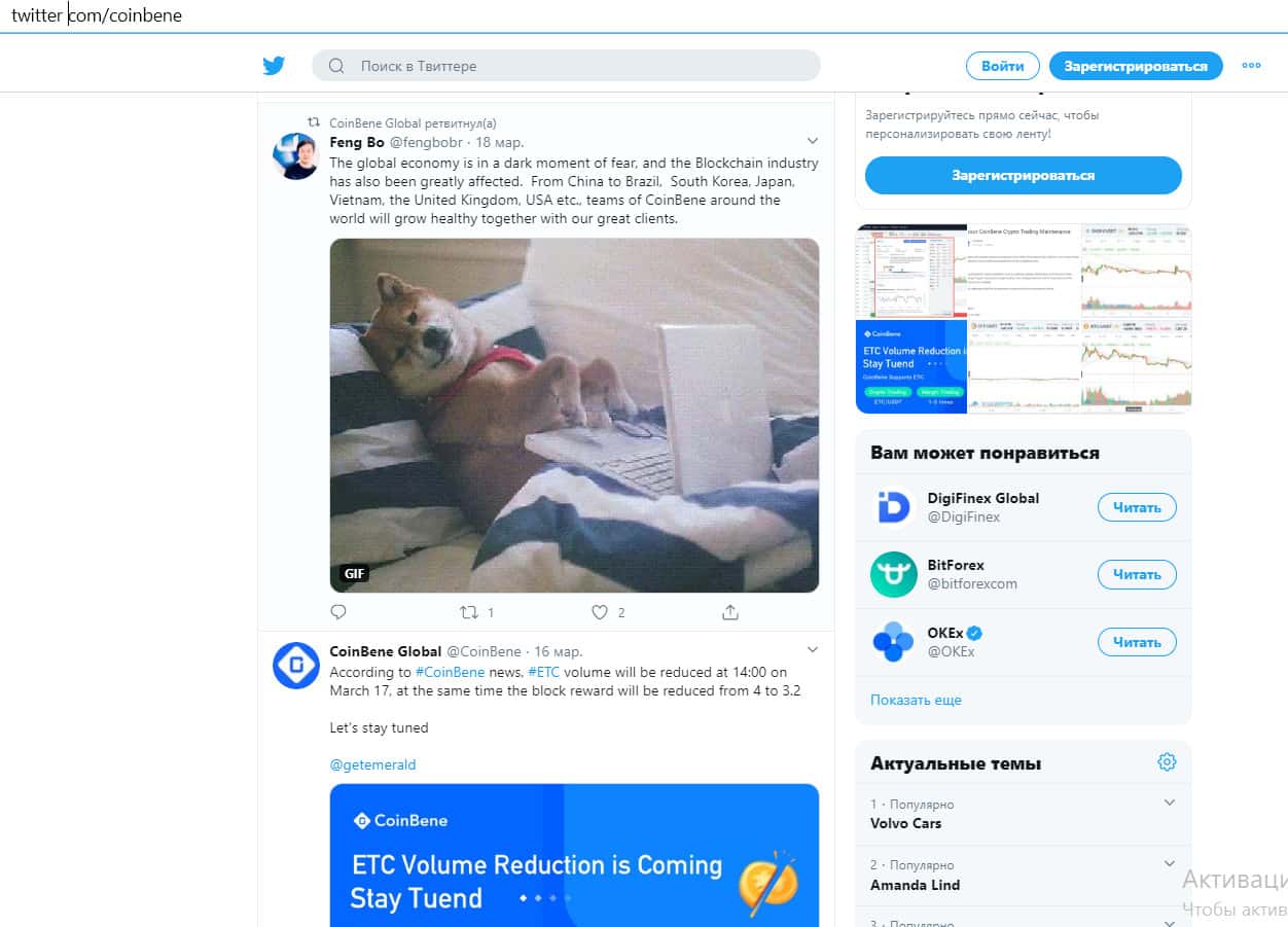 Страница компании CoinBene в Твиттере также читаемая. На нее удалось подписать около 17 000 пользователей. Кроме графиков с валютными парами и токенами, иногда выкладывают смешные посты с котиками и собачками.