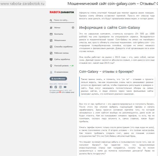 Coin Galaxy очередная псевдоброкерская помойка, где вас обманут опытные мошенники - об этом в обзоре на сайте rabota-zarabotok ru.