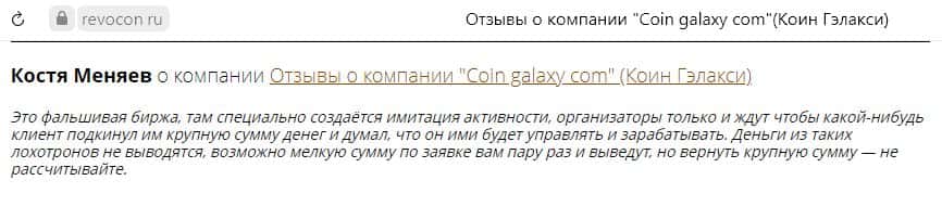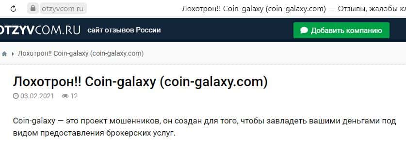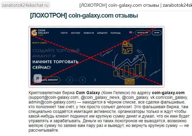 Ниже предлагаем ознакомиться с информацией о криптовалютном лохотроне Coin Galaxy с других сайтов, обнаруженной во всемирной паутине. По версии сайта zarabotok24skachat ru Коин Гэлэкси - фальшивая биржа, где только создается имитация активности.