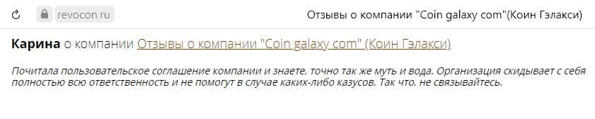 Следующий пользователь внимательно прочитала пользовательское соглашение и тоже обращает внимание, что мошенники Коин Гэлэкси скидывают с себя всю ответственность. А значит не стоит с ними связываться.