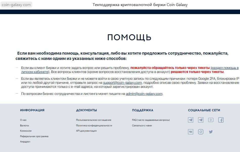 Связаться с самозванцами Coin Galaxy вы сможете через тикеты, и для этого вам надо зарегистрироваться, или, в одностороннем порядке, по указанной почте: