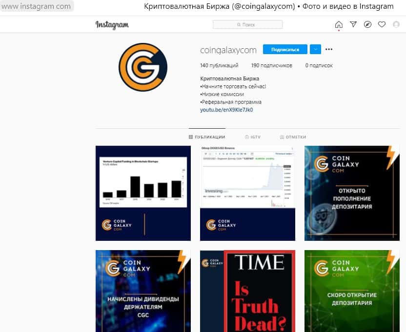 Дабы быть на волне современных трендов жулики Коин Гэлэкси обзавелись страницами в различных соцсетях. Так выглядит страница в Контакте. По количеству подписчиков понятно, что популярностью этот криптолохотрон не пользуется.Еще ниже популярность мошенников Коин Гэлэкси на странице в Инстаграмм. Для раскрученной популярной биржи, коей себя позиционируют аферисты, это слишком слабый показатель.