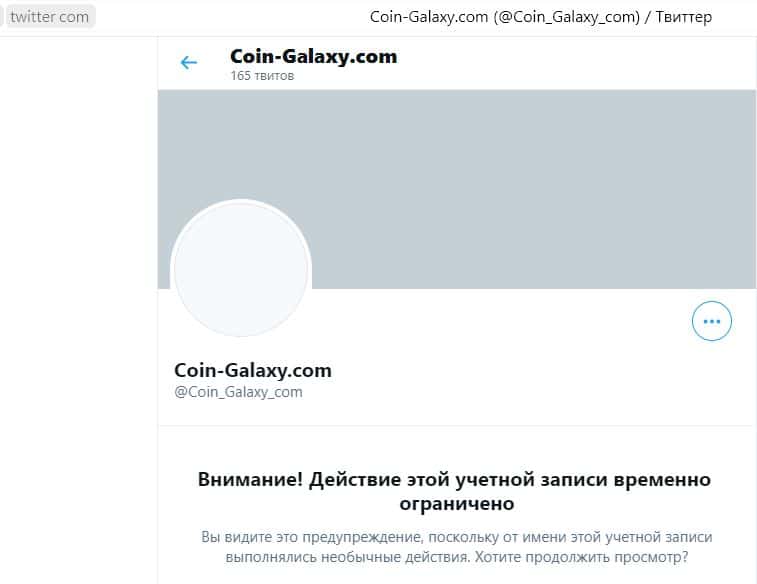 А вот админы сети Twitter решили приостановить действие учетной записи мошенников Coin Galaxy, так как с нее выполнялись необычные действия.