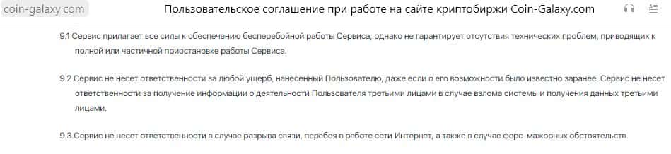 Мошенники Коин Гэлэкси не гарантируют отсутствие технических проблем и бесперебойную работу своего Сервиса. И ответственность за последствия таких сбоев на себя не берут.