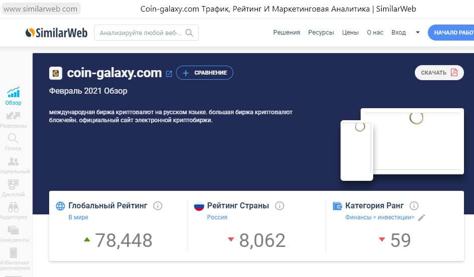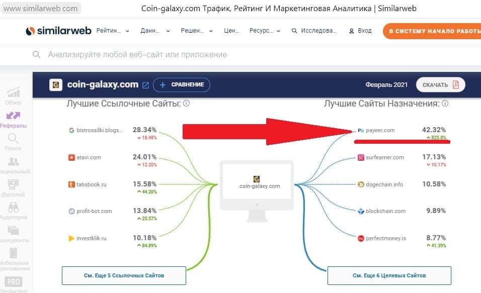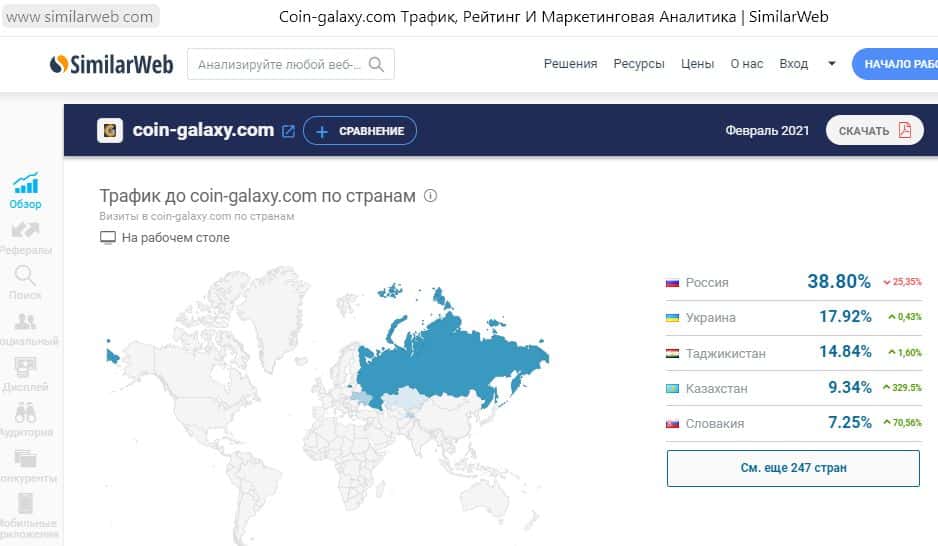 Сайт SimilarWeb проанализировал источники трафика сайта coin-galaxy com, результат вы видите на скрине ниже.