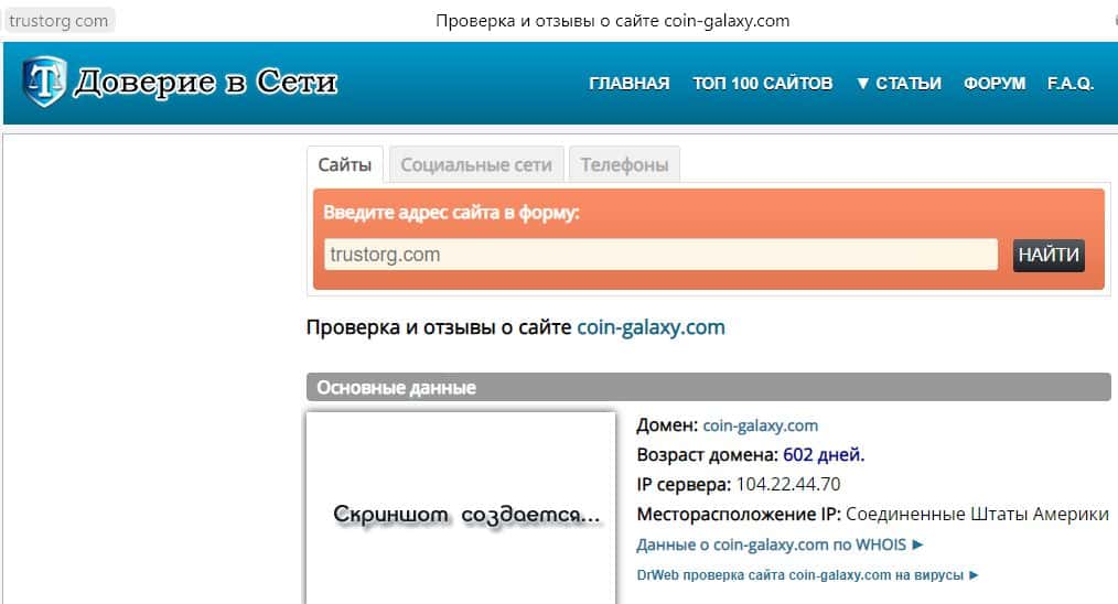 По данным сайта trustorg com домену мошенников coin-galaxy com 602 дня. Но это не повод им доверять. аферисты часто выкупают раскрученный домен, чтобы вызвать доверие пользователей.