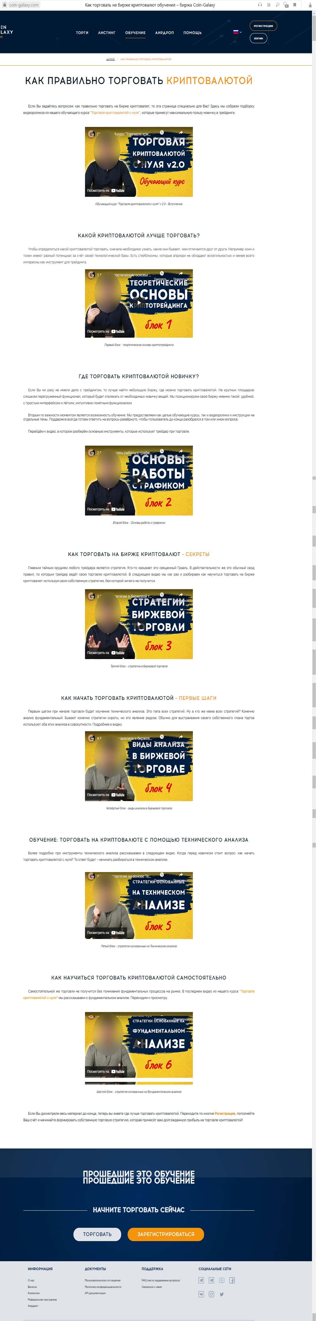 Главная страница сайта выглядит посредственно, шаблонно. И ничего интересного собой не представляет. Напрочь отсутствует информация об услугах лохобиржи Coin Galaxy. Расчет сделал на то, что мир криптовалюты совсем не изучен.