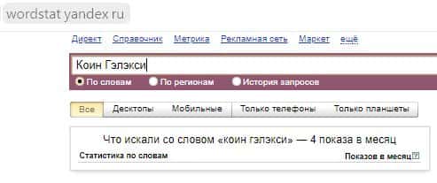 Количество запросов в поисковике Яндекс по бренду "Коин Гэлэкси" составило всего 4 за месяц.