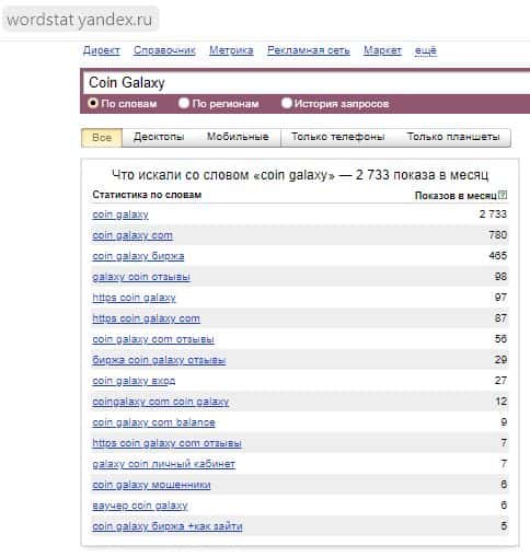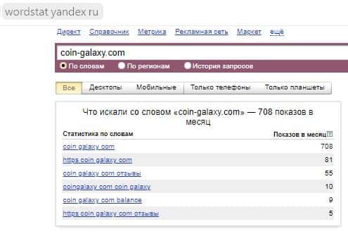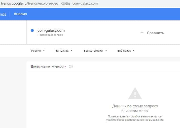 Оценка поисковых запросов портала мошенников "coin-galaxy com" так же не может быть проанализирована из-за их мизерного количества.