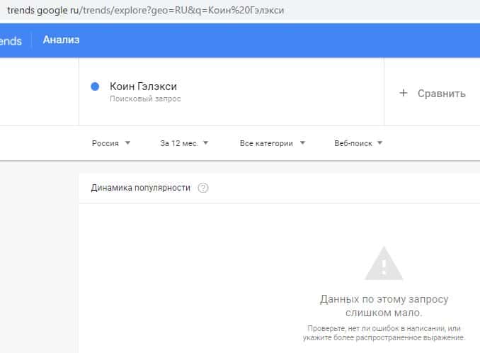 Поисковая система Google не смогла выявить популярность по запросу бренда "Коин Гэлэкси" из-за слишком низкого количества данных.