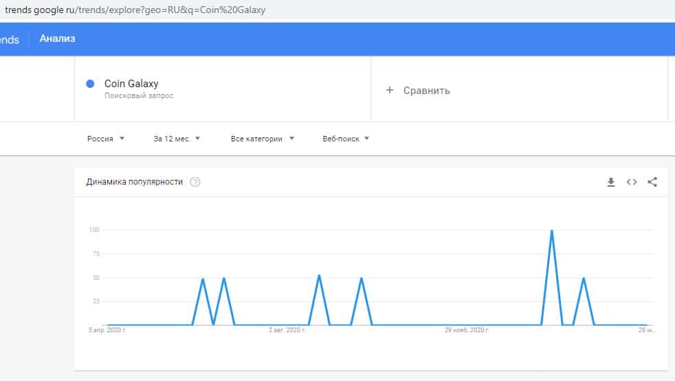 Кривая популярности по бренду Coin Galaxy иногда подпрыгивала, но не высоко и не надолго. В основном пользователям в Google не интересен бренд Coin Galaxy.