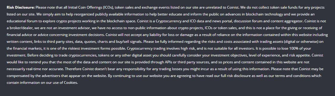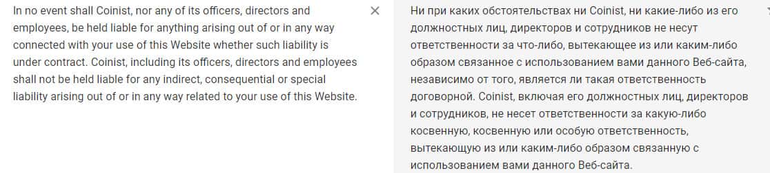 Стоит ли говорить о том, что никакой лицензии у лохотрона Coinist io, не имеется. Пока юный контент-райтер не скачает схему лицензии с Интернета и не закинет на сайт, при том криво её зафотошопив. Вместо этого они прикрепили предупреждение о рисках и понимайте это как хотите, а вот согласно написанному за содеянное, жулье Коин Ист Ио ответственность нести не будет.