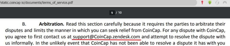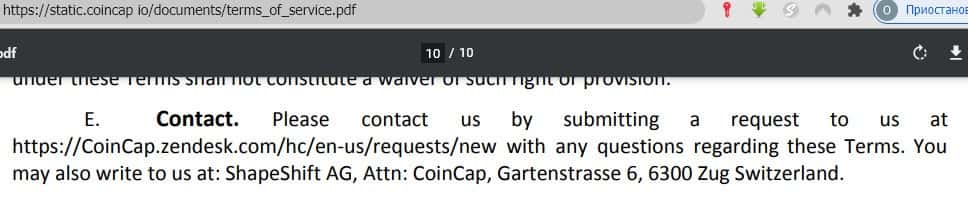 Лишь глубоко в тексте "Клиентского соглашения" удаётся обнаружить адрес электронной почты технической поддержки криптовалютной торговой площадки Коин Кап: