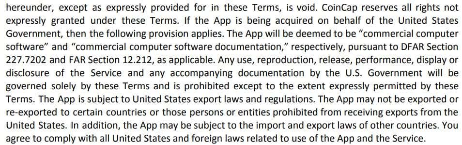 Согласно клиентского соглашения все условия сотрудничества с криптовалютной торговой площадкой Коин Кап регулируются законодательством Соединенных Штатов Америки.