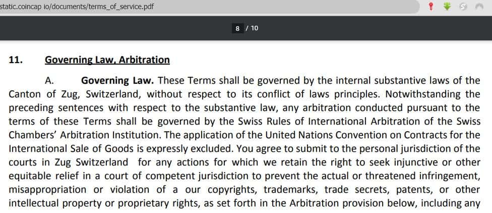 Забыв о подчинении законам США, аферисты из Кои Кап предлагают использовать при разрешении споров с клиентами законодательство Швейцарии.