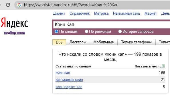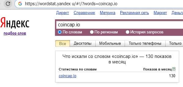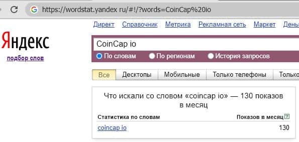 Сайт "coincap.io" искали те же сто тридцать раз за месяц в поисковой системе Яндекса. Что в целом свидетельствует о незначительном спросе на услуги криптоброкера Коин Кап.