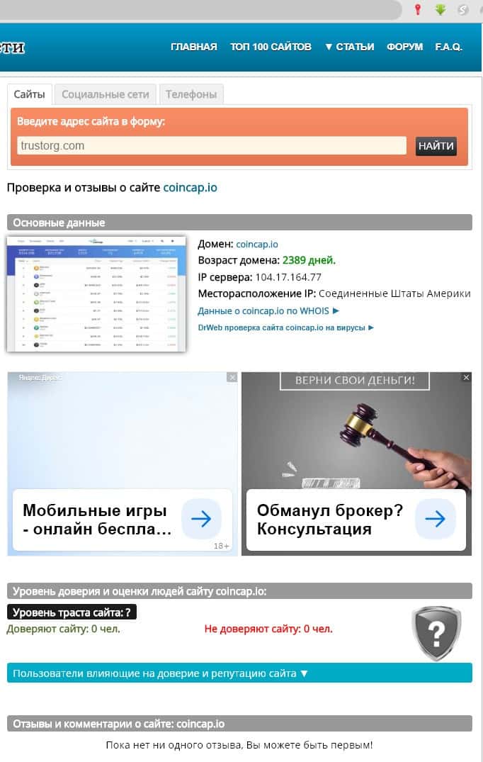 На фоне того, что сайт coincap io работает в сети более шести с половиной лет, сайту "Доверие в сети" так же не удалось провести какой-либо серьезный анализ портала coincap io.