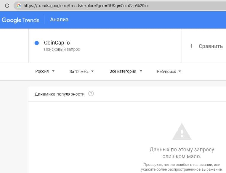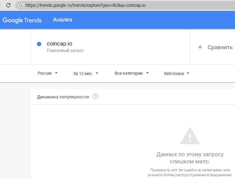 А вот, в латинской транскрипции бренд "CoinCap io" толком никто не ищет. Goggle затрудняется провести анализ таких запросов ввиду их незначительного количества.