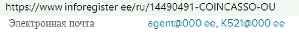 Также пару электронных адресов криптохапуг Коин Кассо удалось обнаружить в каталоге организаций Эстонии. Они имеют абсолютно другой домен, отличающийся от домена сайта: