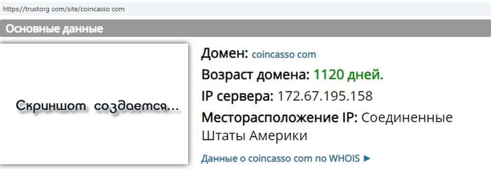 По данным интернет-ресурса трасторг ком, домен жуликов Коин Кассо существует давно, но они специально перекупили возрастной домен, чтоб втираться будущим жертвам в доверие.