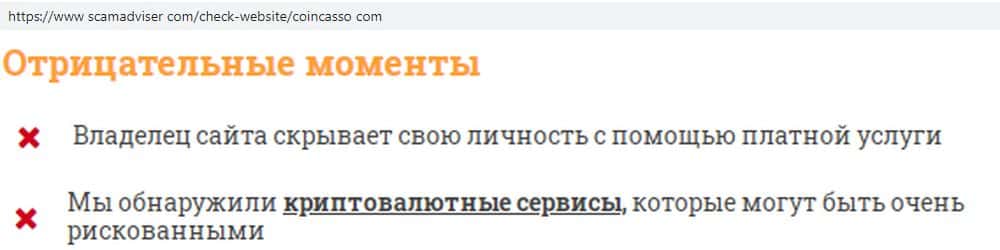 Онлайн-ресурс скамэдвайзер ком предупреждает, что сайт махинаторов Коин Кассо не вызывает доверия: владельцы скрываются и предлагают сомнительные и рискованные услуги.