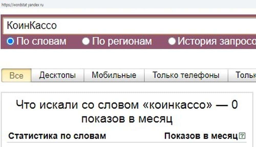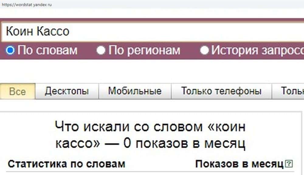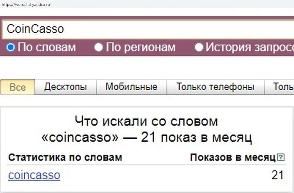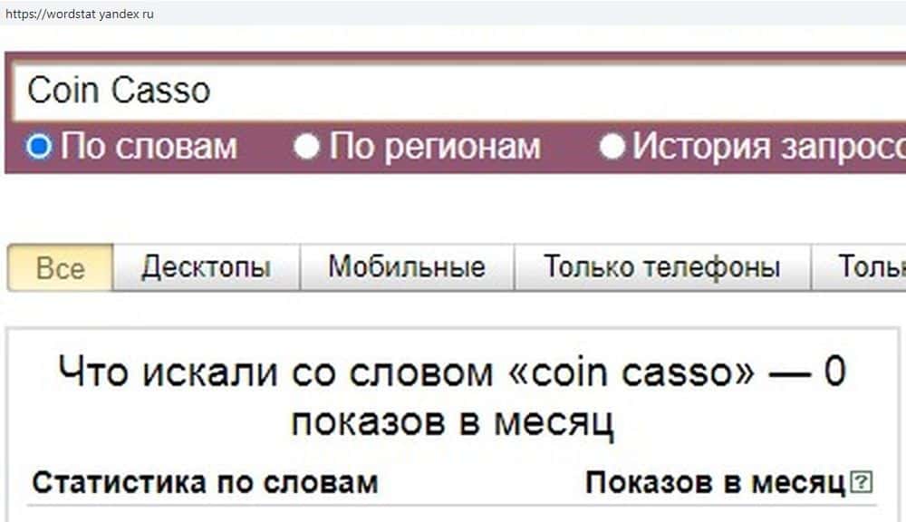 По запросу "Коин Кассо" показов вообще не было. И это не удивительно. Подобных афер очень много, и люди уже перестали обращать на них внимание, так как видят что это ловушка.