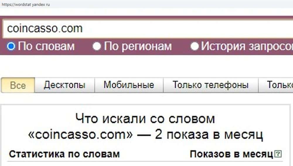 Лохотрон CoinCasso и его сайт-ловушка вообще мало интересует пользователей сети и поисковика Яндекс. По запросу "coincasso.com" было всего 2 показа за прошедший месяц.