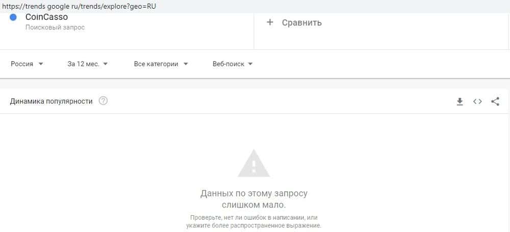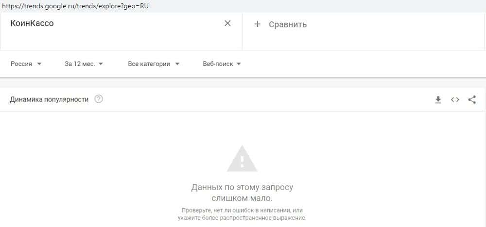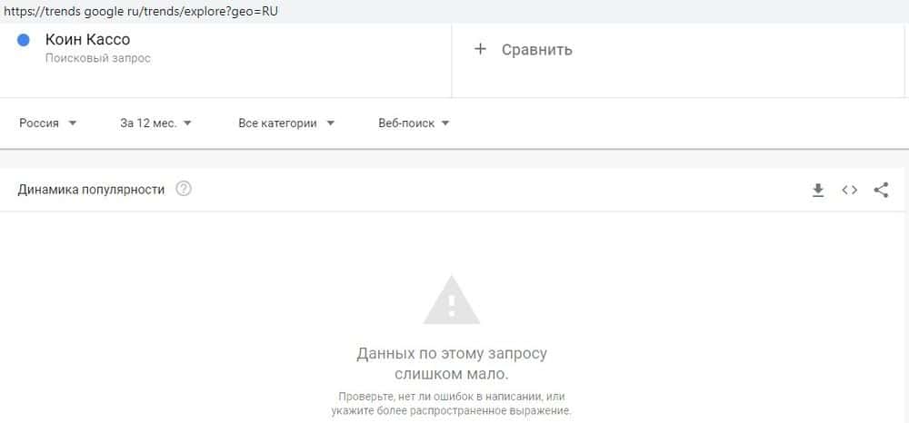 Поисковый запрос "Коин Кассо" также не пользуется популярностью у любителей сервиса Гугл. Мошенники имеют мало шансов задвинуть свою лохушню пользователям Google.