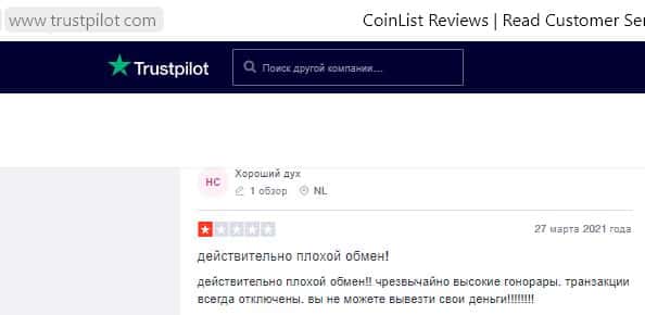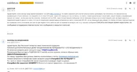 Не может снять деньги еще один клиент Коин Лист. Так же он отмечает непомерно завышенные гонорары этих хапуг.