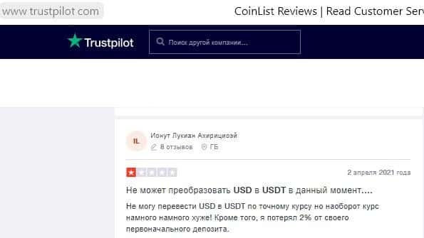 Сервис Коин Лист не может преобразовать USD в USDT, курс плохой, к тому же, потерял 2% от первоначального депозита.