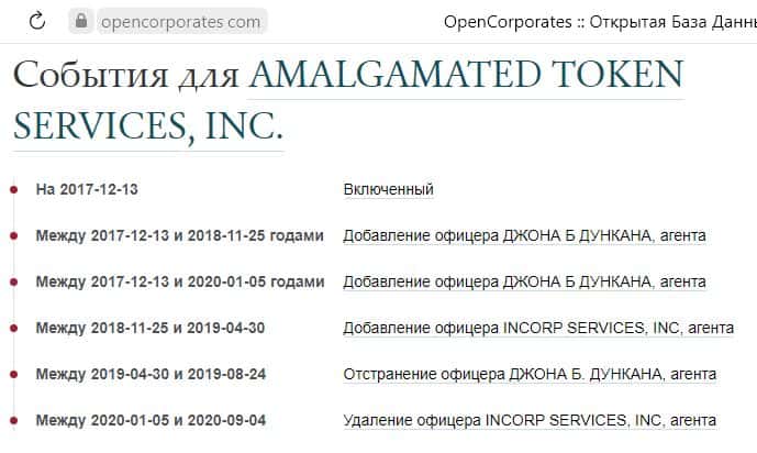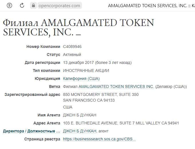 Ниже представлен скрин о данных юрлица, компании Amalgamated Token Services.