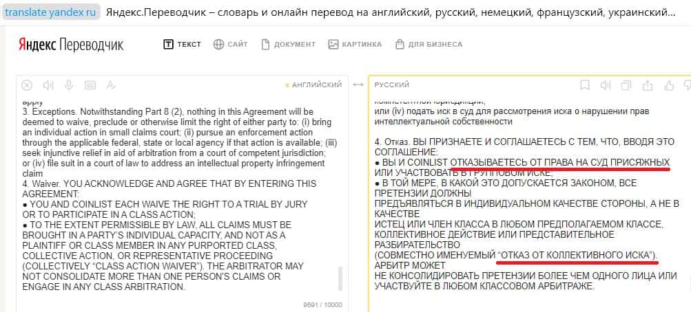 И еще вы должны будете отказаться от права на гуманный суд присяжных и от коллективного иска. Видимо, махинаторы Коин Лист переживают, что желающих подать такой иск будет зашкаливающее количество.