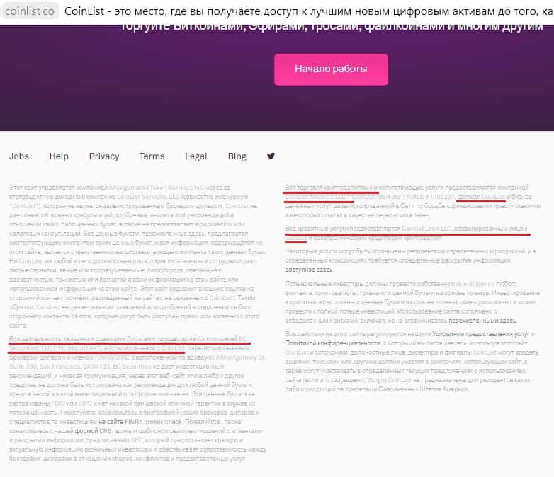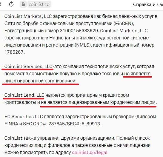 У махинаторов деятельность с ценными бумагами осуществляется компанией LC Securities, аффилированной с CoinList. Торговля криптовалютой - CoinList Markets (филиал CoinList). Кредитные услуги - CoinList Lend LLC.