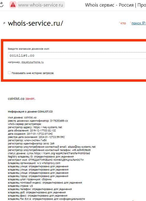 Мы использовали сайт whois-service ru, чтобы узнать кому принадлежит домен coinlist co. Оказалось, что жульническая организация тщательно скрывает эту информацию, а это типичное мошенничество.