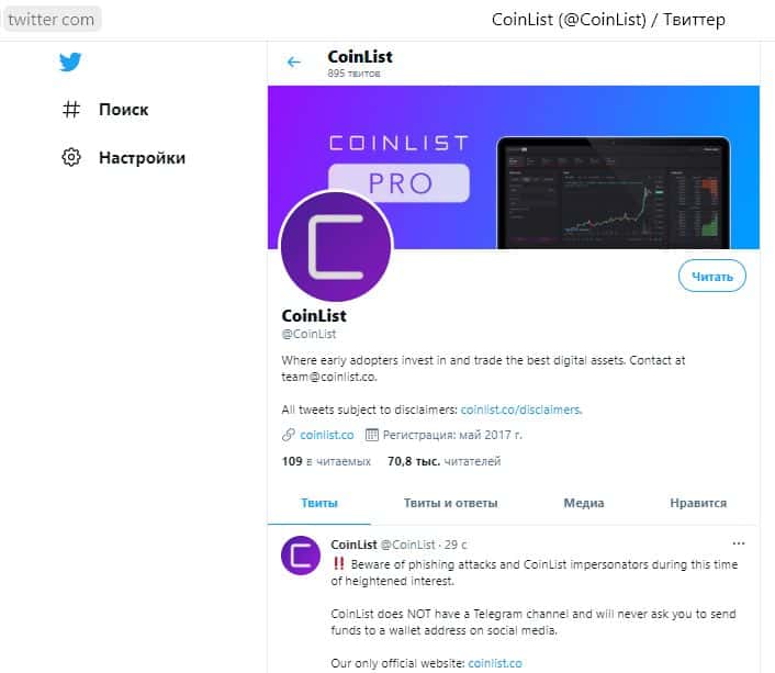Жулики Коин Лист не очень продвинуты в плане позиционирования себя в соцсетях. Они ограничились только страничкой в Twitter.coinlist co - официальный подвал лоховозки Коин Лист