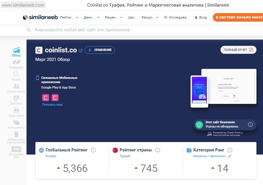 По результатам запроса об источниках трафика махинаторов Коин Лист на ресурсе similarweb com мы наблюдаем некоторый рост интереса к сайту мошенников.