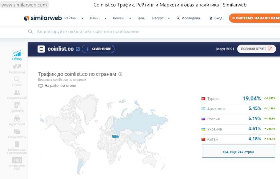 Наиболее популярен coinlist co в Турции, за ней интерес проявляют Аргентина, Россия, Украина и Китай.