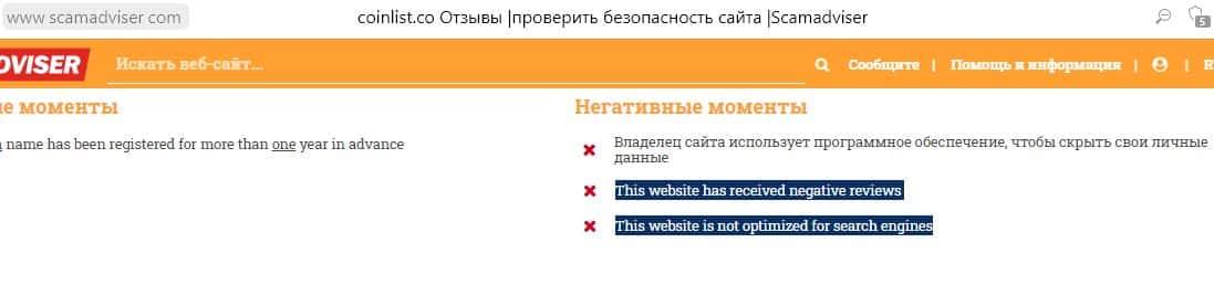 При анализе сайтом Scamadviser обращается внимание, что лохотрон Коин Лист имеет много отрицательных отзывов и, что он не оптимизирован для поисковых систем, а значит скрывается отответственности.