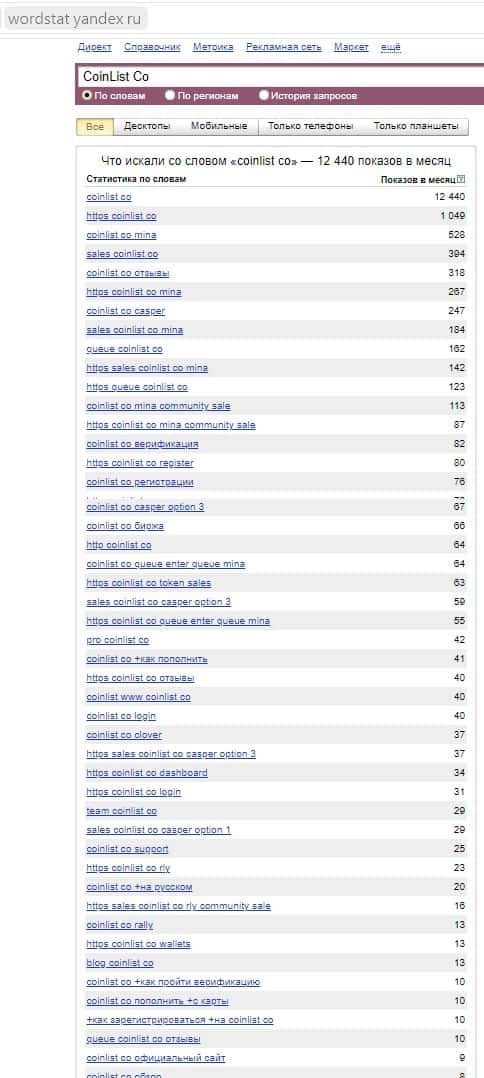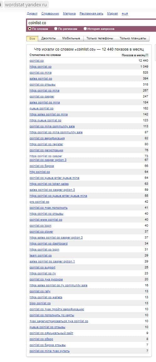 По бренду "CoinList Co" количество запросов еще больше, 12440 раз за месяц.