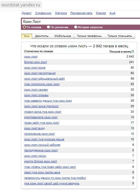 В поисковике Яндекс количество запросов по бренду "Коин Лист" составляет 2842 раза за месяц. Интерес пользователей к криптовалюте растет.