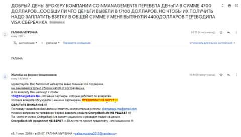 Женщина поделилась с нами своей историей, в которой она связалась с брокерской конторой Коин Менеджментс и перевела туда сумму в размере 4700 долларов, после этого ей стали впаривать, что есть сумму, которую можно получить и для этого нужно вложить еще. Благо что служба ChargeBack.Me остановила это издевательство.