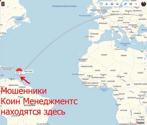 Дополнительным преимуществом для аферистов Коин Менеджментс является их факт оффшорной регистрации, а именно: Suite 305, Griffith Corporate Centre, Kingstown, St. Vincent & the Grenadines, что дает жуликам дополнительную анонимность, а все судебные разбирательства должны происходить на территории оффшора.