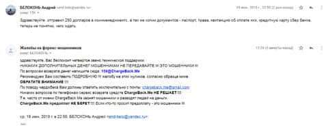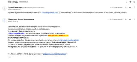 Очередной пользователь глобальной сети написал на почту сайта по сбору жалоб на брокеров-мошенников, поделившись своим плачевным опытом работы с КоинМенеджментс. По поводу возврата утраченного ему необходимо обратится в сервис ChargeBack.Me где возможно ему помогут.