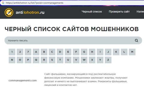 В связи с полу годовалой деятельностью мошенников CoinManagements отзывов о шулерах в сети интернет нету. Однако даже несмотря на свой коротки период жизни жулики Коин Менеджментс уже успели попасть в черные списки многих порталов, одним из которых является antilohotron ru.