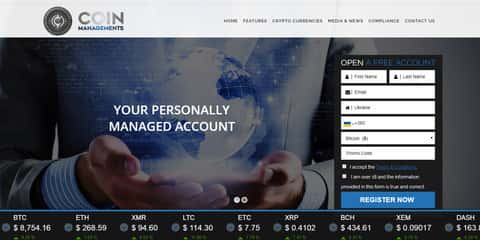 Начинается сайт у аферистов CoinManagements с типичной для подобных аферистов шапки сайта, в которой уже присутствует форма для регистрации новой жертвы шулеров Коин Менеджментс. На изображении ниже вы можете увидеть внешний вид сайта аферистов CoinManagements.